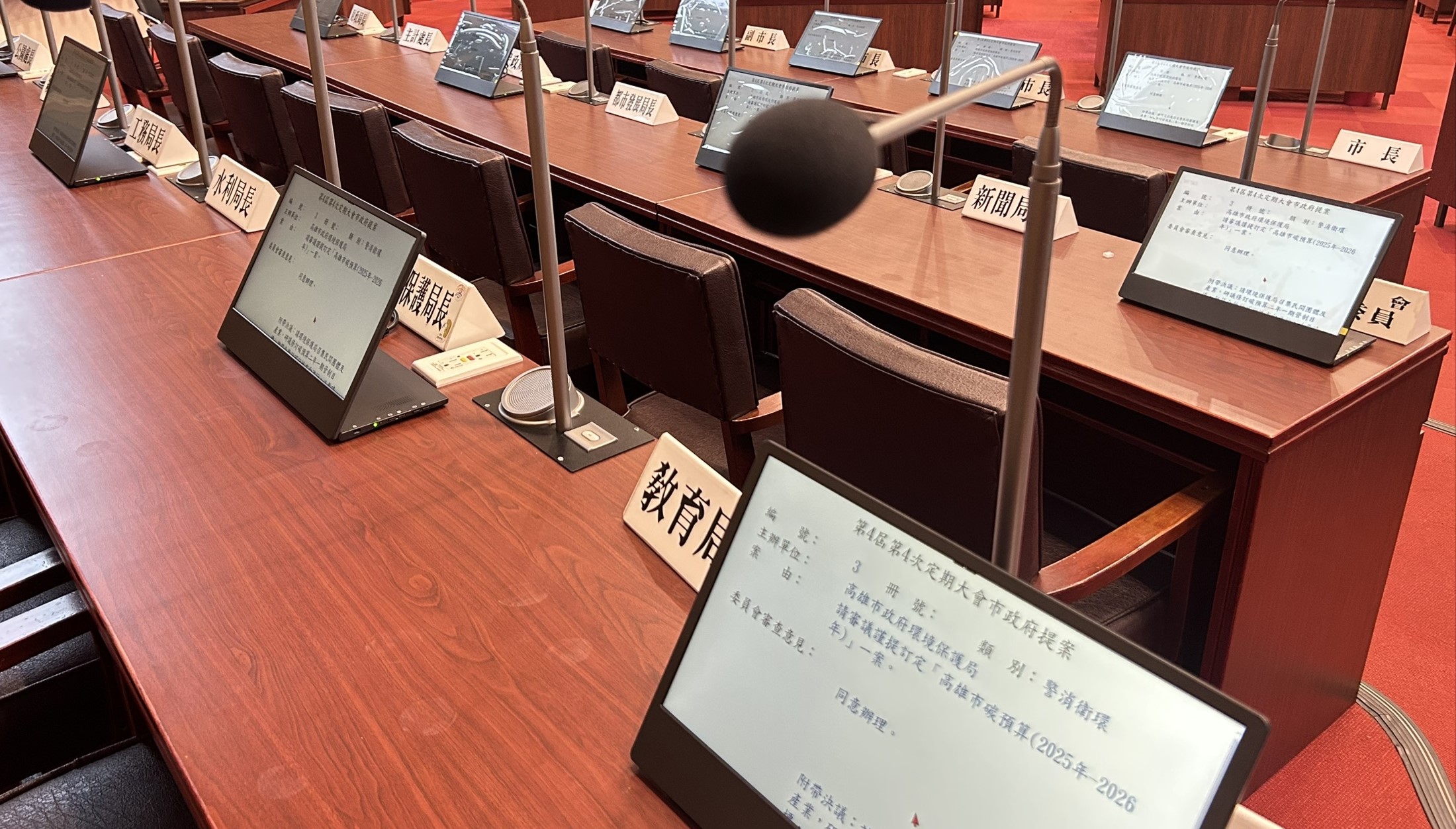 圖說:高市議會議事廳新增桌上顯示器,議員與備詢官員可就近清楚查看,提升議事效率與資訊品質。(圖片來源:高雄市議會提供)