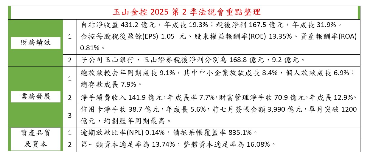 獲利部分,黃男州指出,玉山金7月自結稅後盈餘34.6億元,累計前7月稅後盈餘202.1億元,創歷年同期獲利最高,年增30.9%,EPS達1.25元;主要子公司玉山銀行累計前7月稅後盈餘200.7億元,年增40.8%,表現都相當不錯。