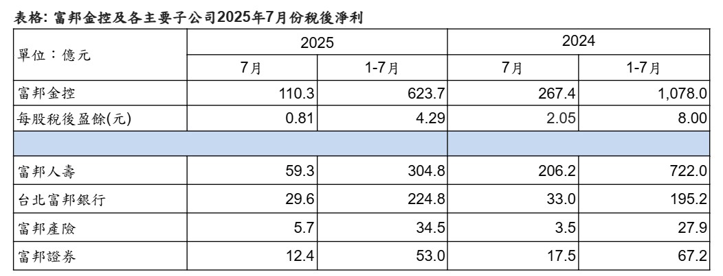 子公司台北富邦銀行累計前7月獲利創下歷年同期新高;富邦產險、富邦證券累計前7月獲利皆為歷年同期次高。