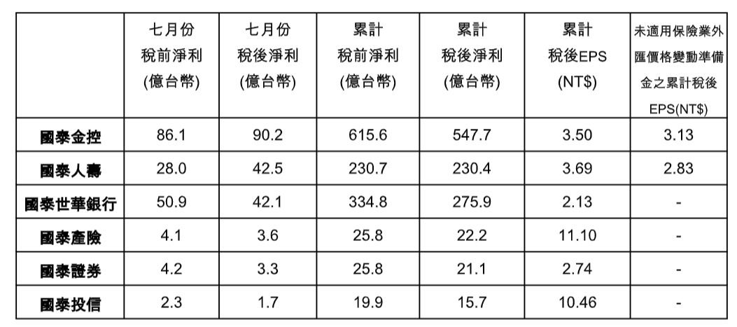 國泰金自結7月稅後淨利90.2億元,累計前7月稅後淨利547.7億元,EPS為3.5元,蟬聯金控獲利亞軍,但也同樣低於去年同期的EPS 6.07元。