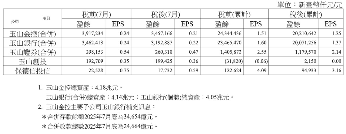 主要子公司玉山銀行累計前7月稅後盈餘200.7億元,年增40.8%;玉山證券11.8億元;玉山創投0.02億元;保德信投信前7月獲利0.95億元。