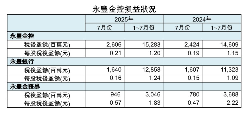 永豐金7月自結稅後盈餘26.06億元,累計前7月稅後盈餘152.83億元,EPS為1.2元,同樣創歷史同期新高。