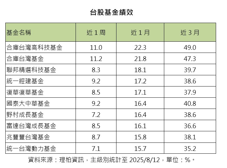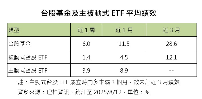 理柏資訊統計截至8/12,138檔台股基金近1周、1月、3月平均漲幅達6%、11.5%、28.6%;優於62檔被動式台股ETF的同期表現,以及5檔主動式台股ETF。