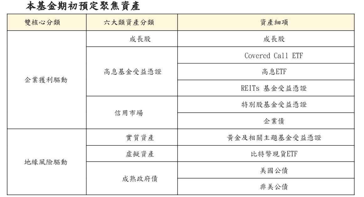 黃金類資產(含ETF與主題基金)預計最高配置不超過20%;比特幣ETF配置上限為5%,係依金管會現行法規對虛擬資產ETF之投資上限規定。