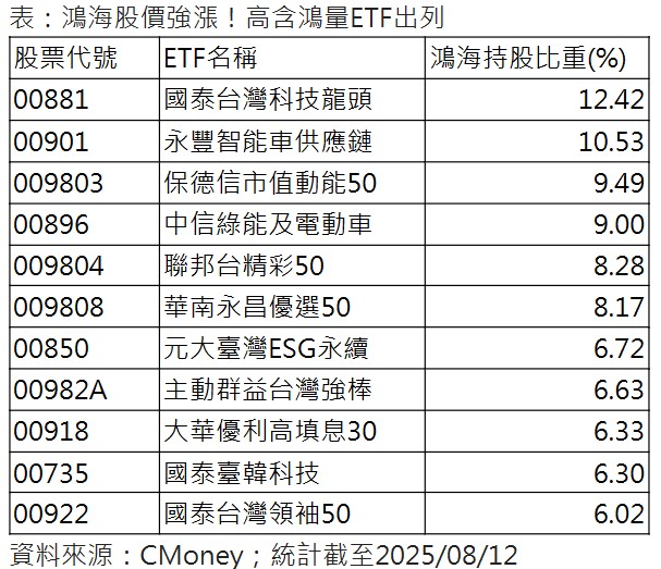 持有鴻海比重超過6%以上的「高含鴻量ETF」,共有11檔,包括國泰台灣科技龍頭(00881)、大華優利高填息30 (00918)。