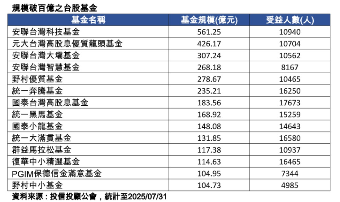 台股挑戰歷史新高,台股基金買氣也跟著水漲船高,根據投信投顧公會最新統計,共有14檔台股基金規模突破百億元大關,包括PGIM保德信金滿意、安聯台灣科技、元大台灣高股息優質龍頭、安聯台灣大壩、安聯台灣智慧、野村優質、統一奔騰、國泰台灣高股息、統一黑馬、國泰小龍、統一大滿貫、群益馬拉松、復華中小精選、野村中小,14檔基金的總受益人數超過17萬人。