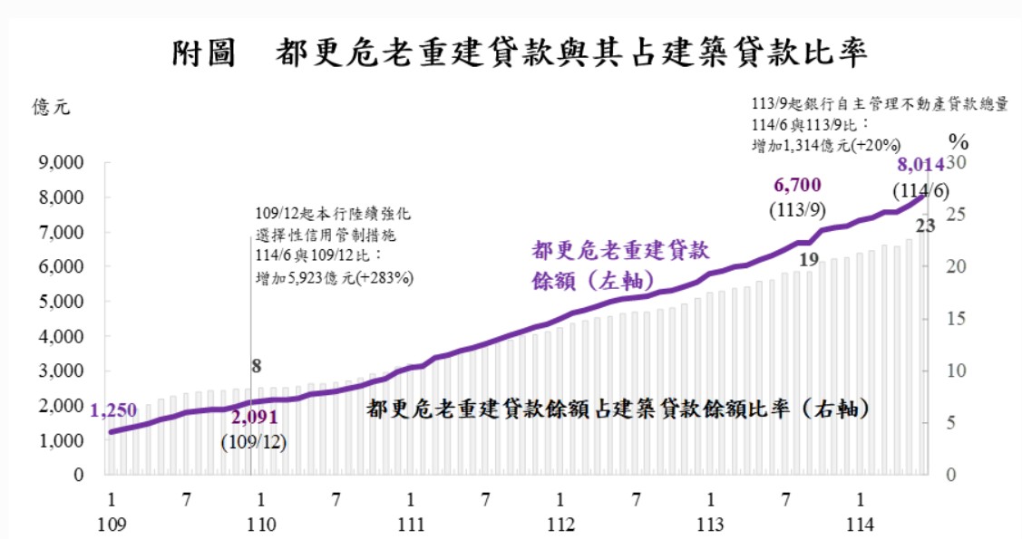 (一) 由於都更危老重建貸款未受本行規範限制,上年9月以來本國銀行都更危老重建貸款年增率均逾20%,本年6月底為26.73%,遠高於全體銀行建築貸款增幅2.01%;都更危老重建貸款占建築貸款比重由上年9月底之19%上升至本年6月底之23%。(如下圖,央行提供)