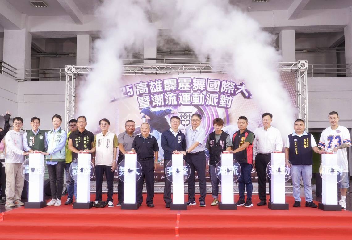 ↑圖說:今日活動出席貴賓共同啟動光柱,為2025高雄霹靂舞國際大賽暨潮流運動派對共同揭開序幕。(圖片來源:高雄市運發局提供)