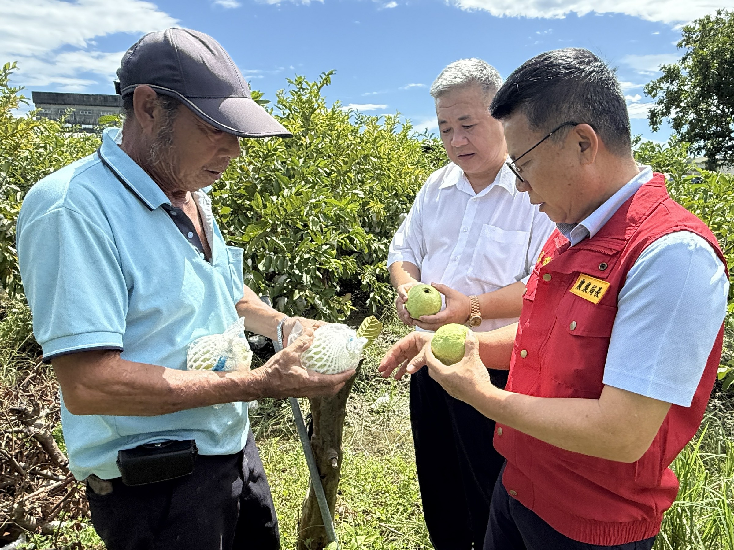 ↑圖說:農業局局長姚志旺關心燕巢區芭樂園受災情況(圖片來源:高雄市農業局提供)