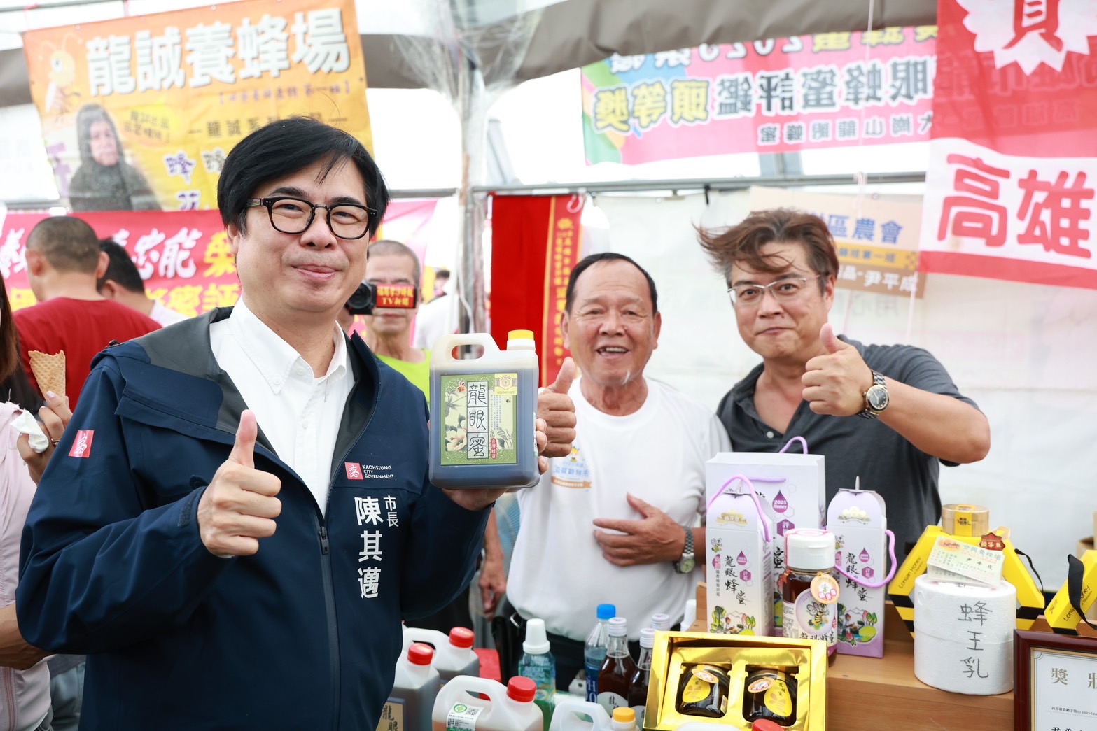 陳其邁笑稱「好東西與好朋友分享」,並透露自己皮膚保養的秘訣就是蜂蜜,推薦大崗山龍眼蜜品質最優秀、最衛生、最安全。他指出,去年受極端氣候影響產量僅288噸,感謝農糧署、農業部開放天然災害救助,協助農民度過難關;今年花期氣候理想,蜜源充足,讓高雄龍眼蜂蜜展現「蜜中極品」的獨特風味。