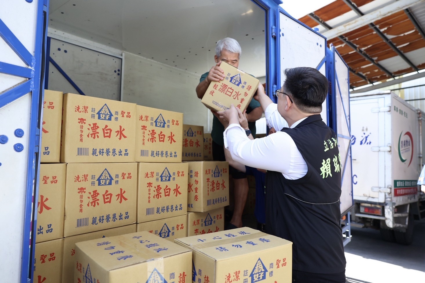 圖說:賴瑞隆將漂白水搬上車運往災區。(圖片來源:賴瑞隆辦公室提供)