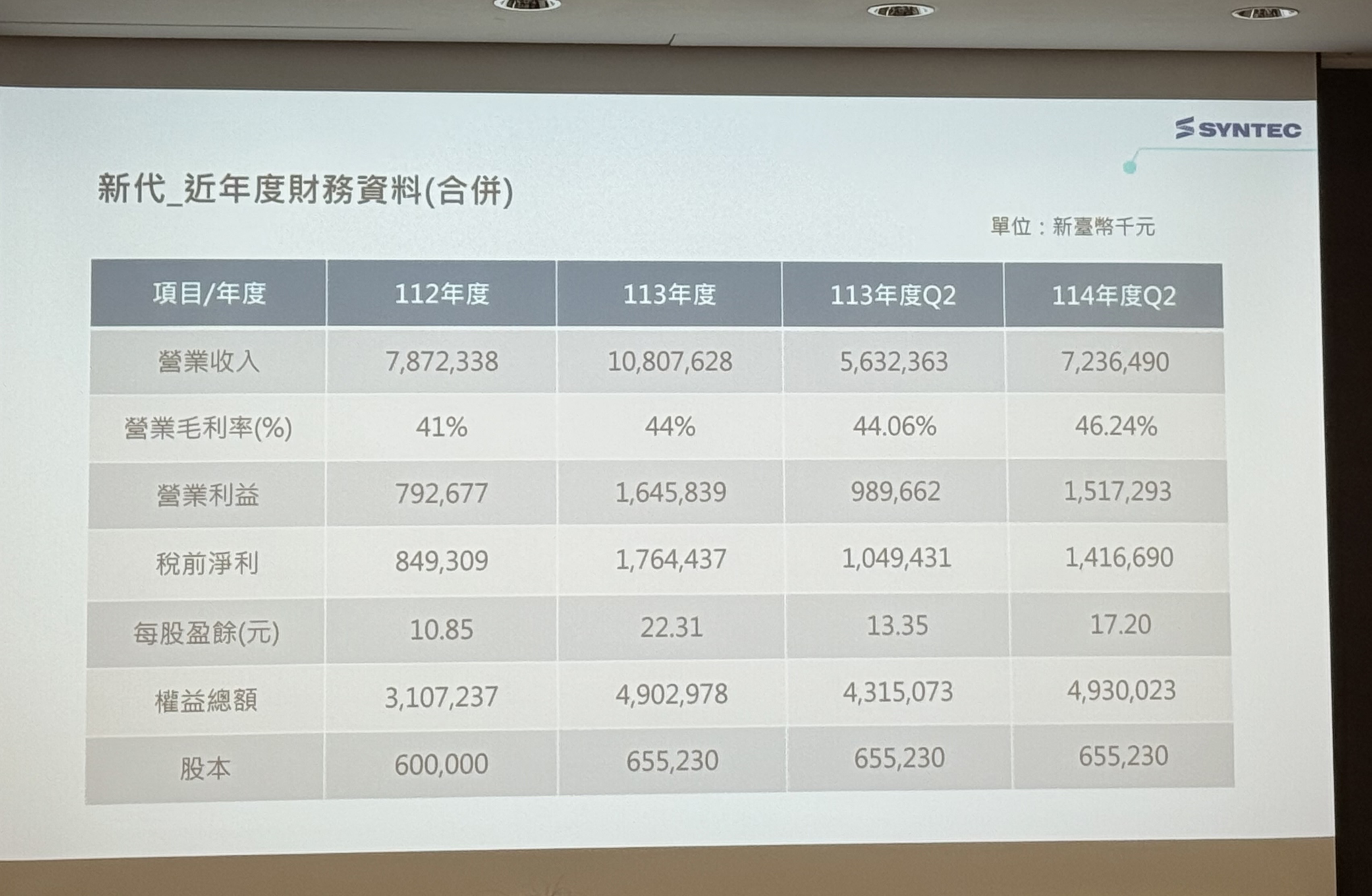 前年,新代營收78.7億元,毛利率41%,稅前盈餘8.49億元,每股盈餘(EPS)10.85元;去年,營收成長至108億元,毛利率44%,稅前盈餘17.64億元,EPS暴增至22.31元;今年,前7月營收81.84億元,年增25.72%;上半年稅後淨利10.8億元,年增34.1%,EPS達17.2元。