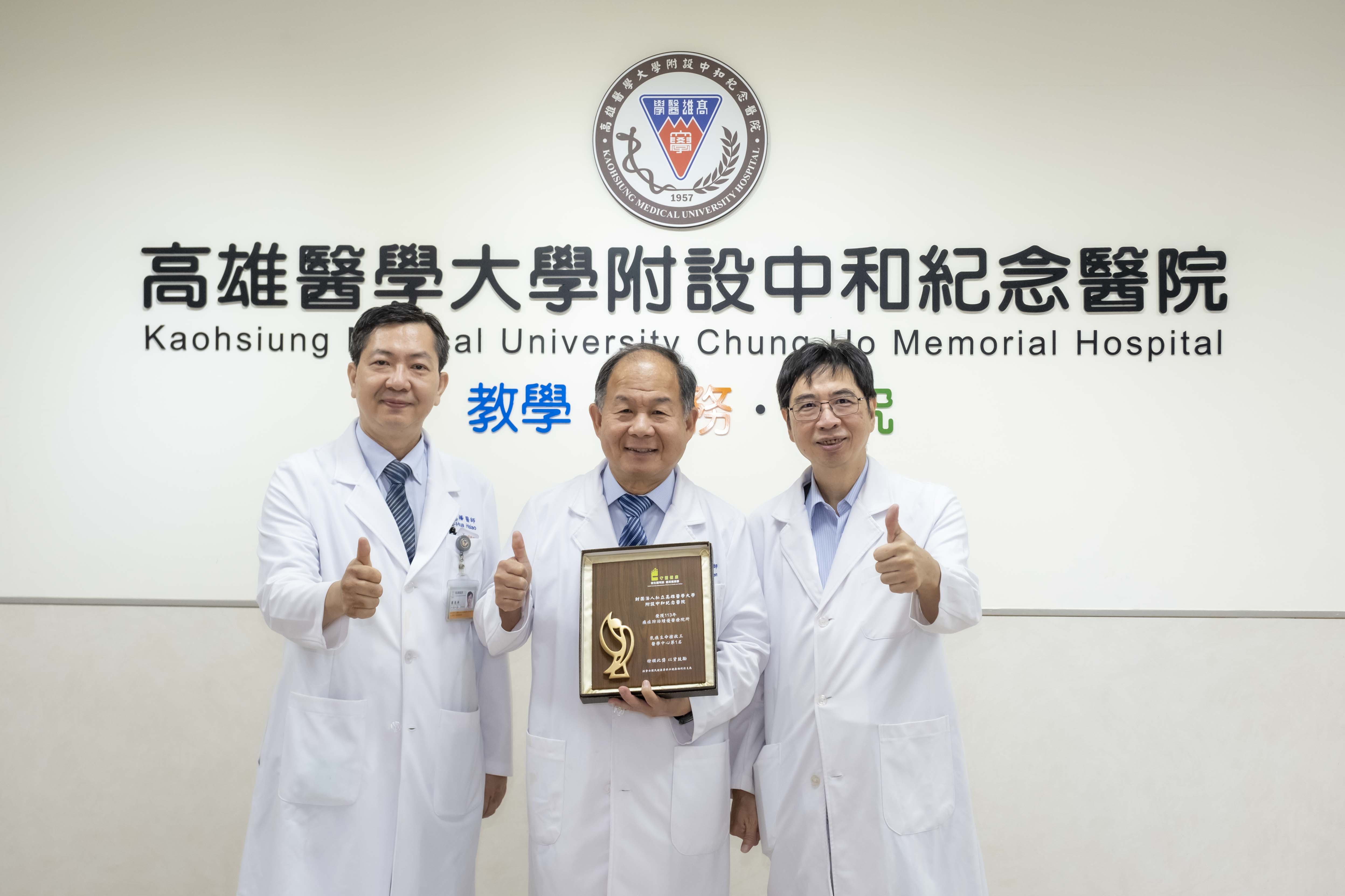 圖說:陳芳銘(中)攜高醫榮獲國健署「乳癌生命搶救王」殊榮。(圖片來源:高醫提供)