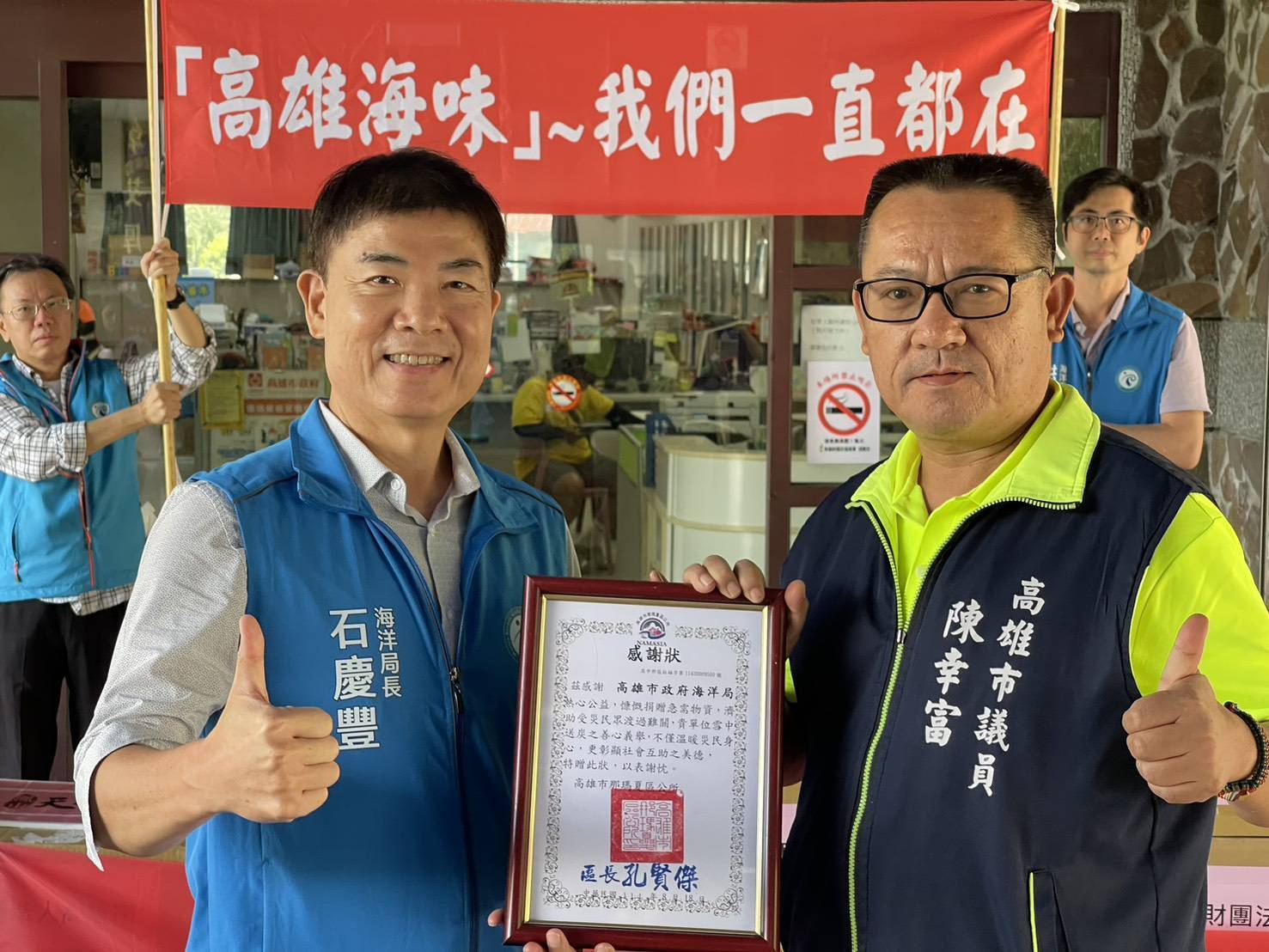 ↑圖說:高雄市議員陳幸富代表當地致贈感謝狀(圖片來源:高雄市海洋局提供)