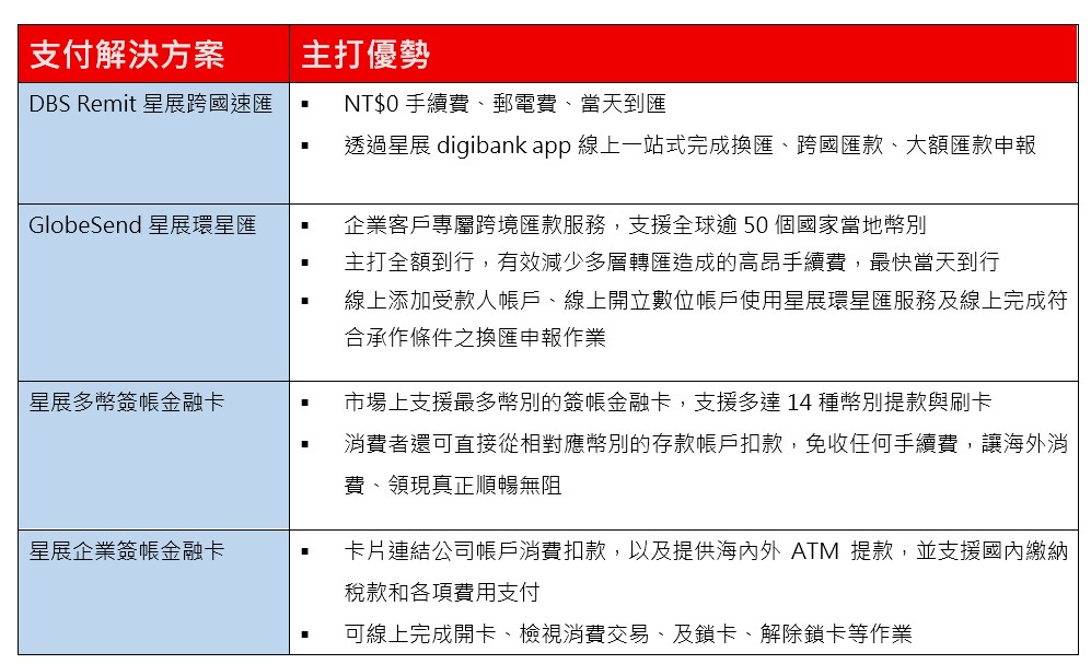 為回應客戶需求,星展此次推出的創新解決方案,解決個人與企業在跨境匯款與支付所面臨的痛點,致力協助企業加速國際營運,與個人輕鬆掌握海外消費與資金管理。
