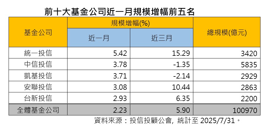 進一步來看,投信投顧公會七月底數據顯示,全體基金公司規模近一月增加2198億元,增幅2.23%。前十大基金公司中,以統一投信規模大增5.42%最高。