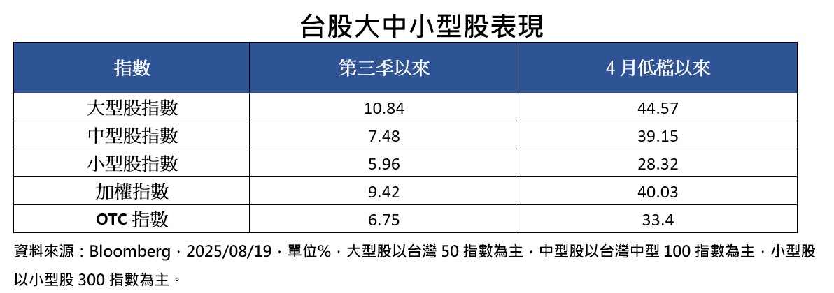 保德信指出,統計4月台股低檔以來,大型股指數強彈44.57%,優於中型股指數的39.15%,更勝過小型股指數的28.32%,顯見這波台股多頭主要由科技大型股領軍驅動,也反映出大型股在不確定環境中更能發揮穩定優勢,進而吸引資金買盤。
