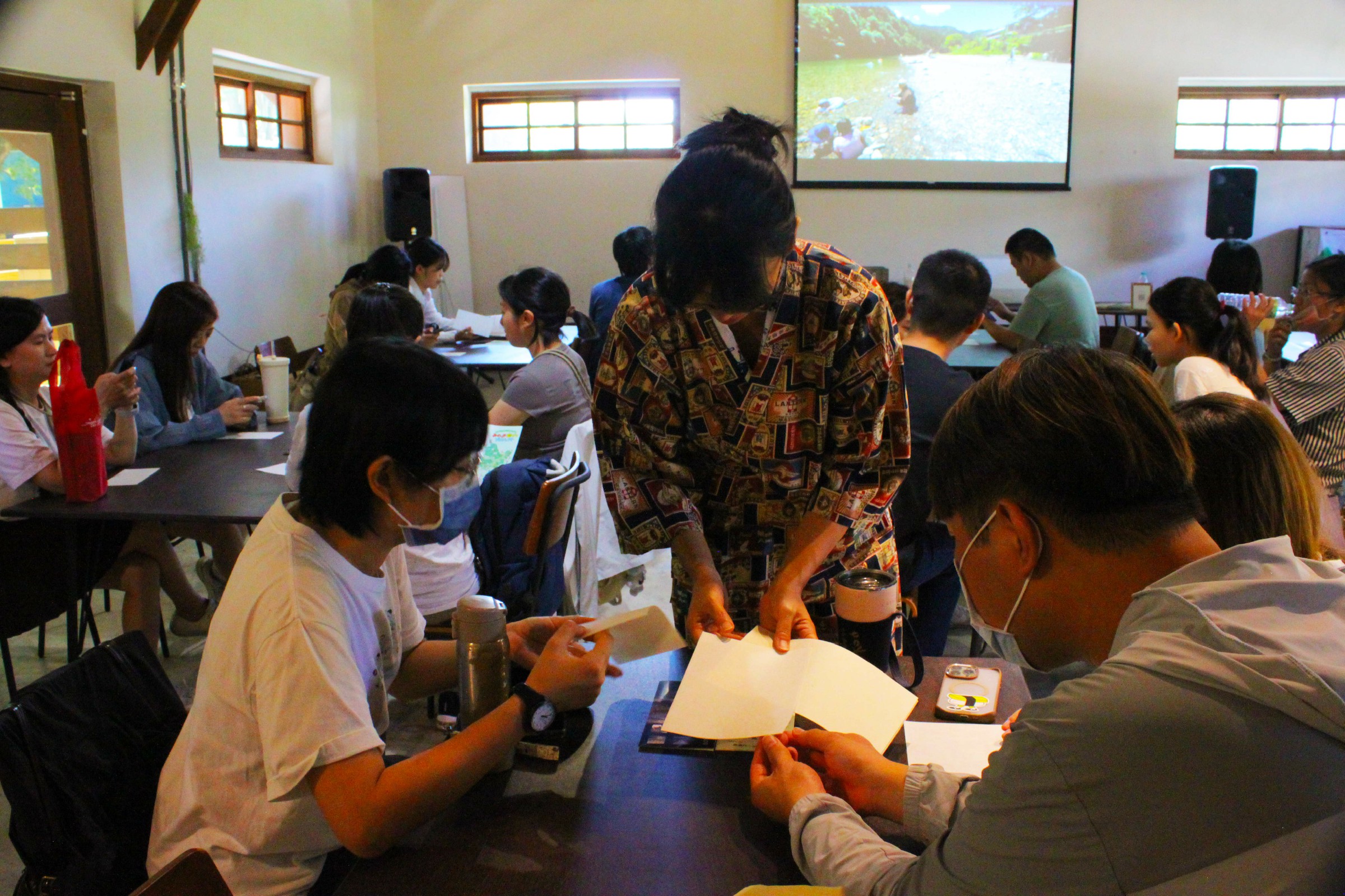 ↑圖說:來自日本岐阜縣美濃市的寺田和紙工房寺田幸代老師(站立者),帶領學員體驗傳統和紙工藝創作。(圖片來源:高雄市青年局提供)