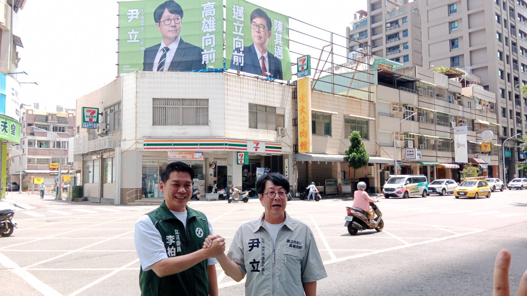 圖說:尹立(右)宣布參選左營、楠梓區高雄市議員,首面競選看板同步上架。(圖片來源:韓文明拍攝)