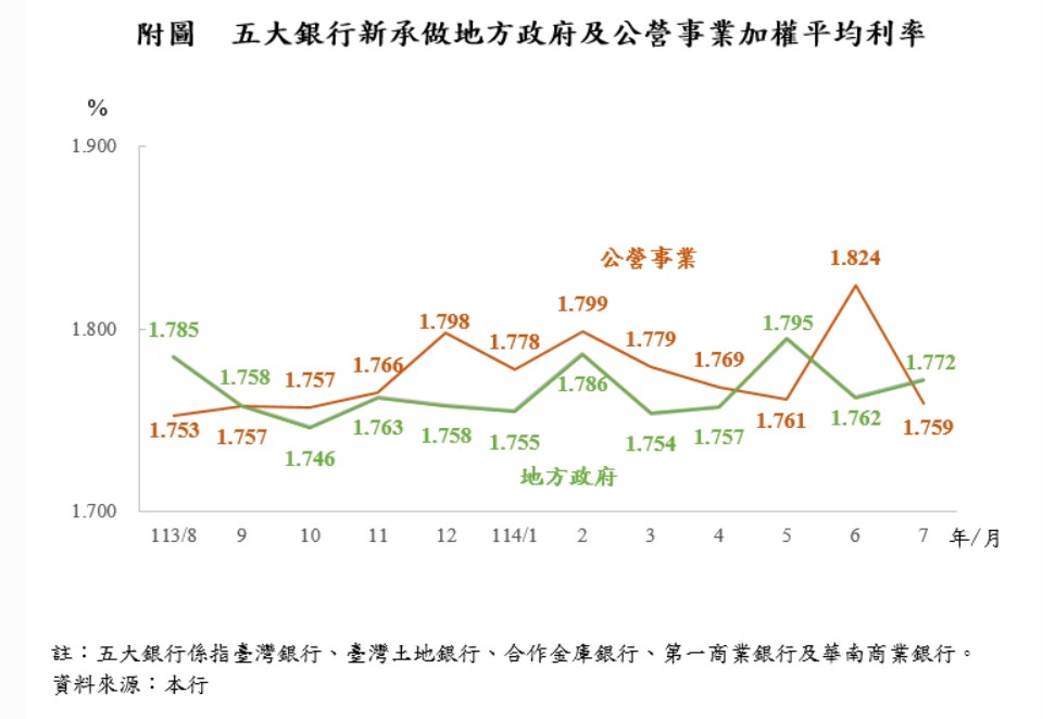 央行發表聲明,強調去(113)年8月請銀行自主管理不動產貸款總量以來,五大銀行新承做地方政府及公營事業放款加權平均利率,並無明顯下降,且對政府及公營事業放款增加幅度,顯著小於個人及民營企業。