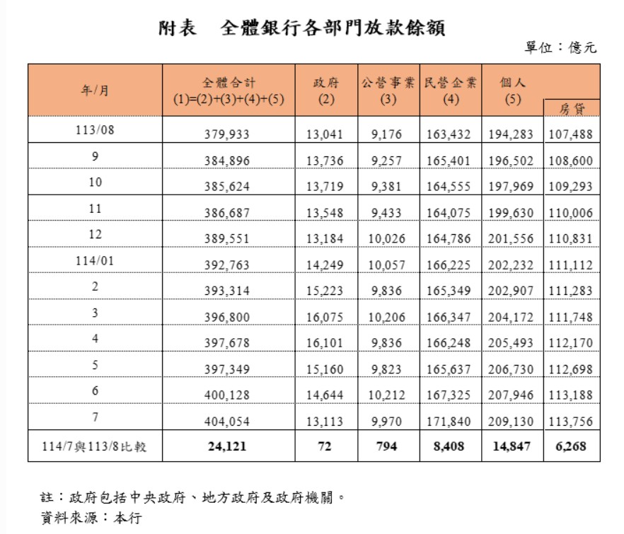(三)放款餘額方面,本(114)年7月底相較於上年8月底,全體銀行放款增加2.4兆元,各部門放款均有增加;其中,以個人放款增加1.5兆元為最多,主要係房貸增加6,268億元,民營企業增加8,408億元,公營事業及政府分別增加794億元及72億元,亦無「肥政府 瘦民眾」的情況。