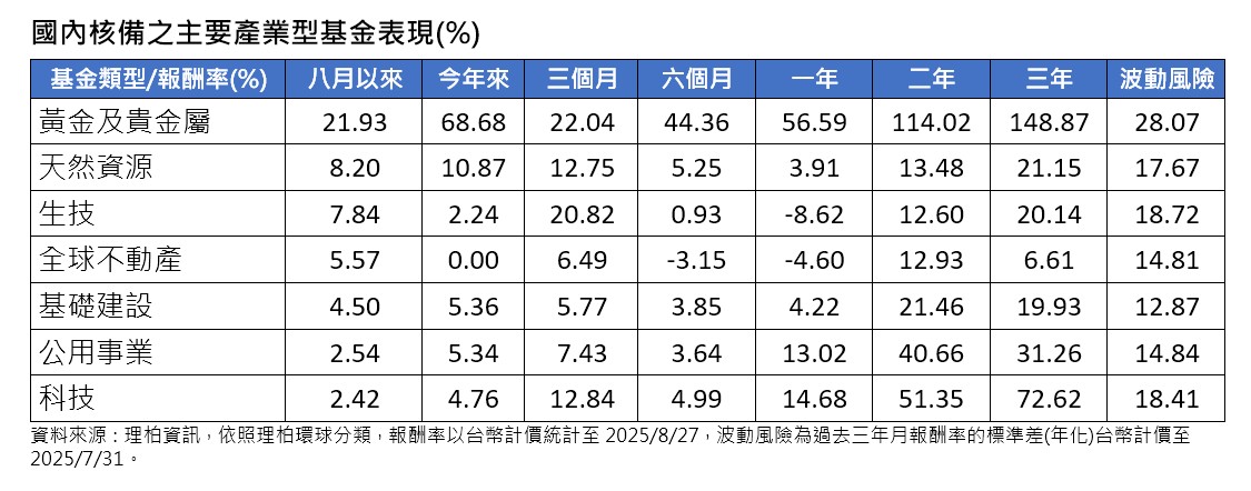 進一步來看,8月表現最亮眼的,無非是黃金及貴金屬股票型基金,狂飆21.93%,遙遙領先其他產業型基金,富蘭克林證券投顧指出,主因是美國聯準會可望重啟降息,以及川普總統過度干預聯準會人事,再次引發投資人對聯準會獨立性的擔憂,激起投資人對黃金的信任需求。