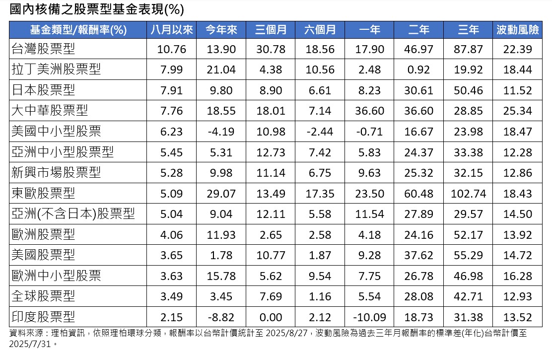 反觀受美國高關稅威脅和被資金排擠的印度股票基金,表現居後,8月以來僅上漲2.1%。