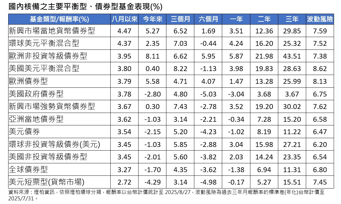 主要債券及平衡型基金部分,債市滿懷著聯準會將於9月重啟降息的期待,呈現齊揚的榮景。其中,以新興市場當地貨幣債券型平均上漲4.47%領先,漲幅甚至高於環球平衡型基金的4.37% 。