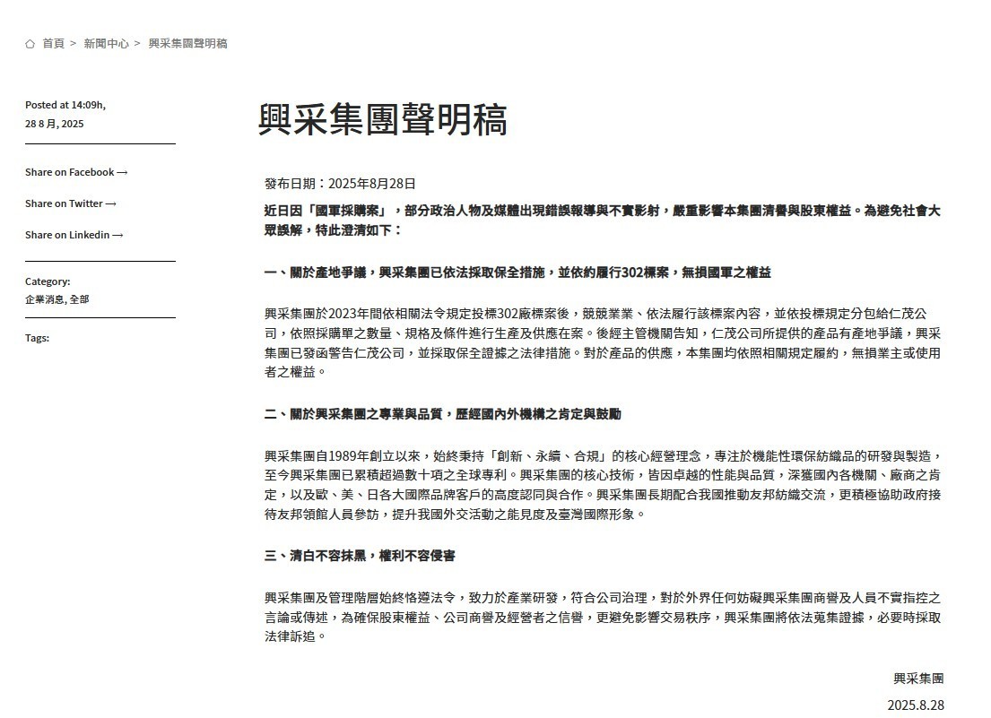 圖說:針對立委質疑國防部的軍品採購案產地,興采集團發布嚴正聲明,強調「清白不容抹黑」,依約履行標案,無損國軍之權益。圖片來源/興采集團官網