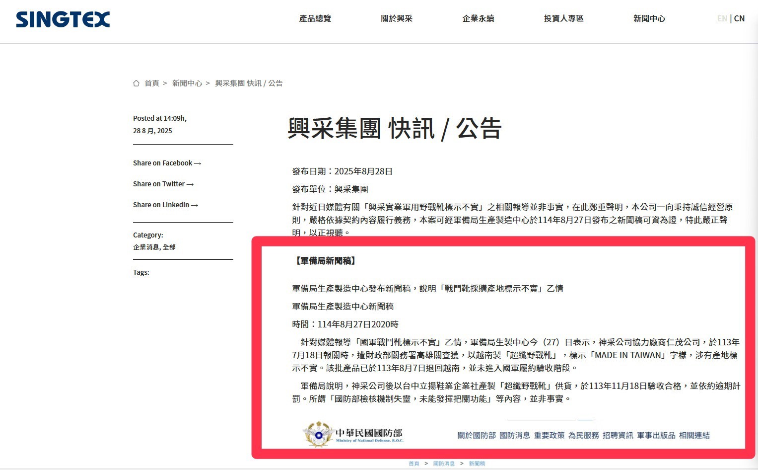 圖說:軍備局說明興采集團的分包商被查獲報關產地標示不實,已悉數退運,興采集團之後以台中產製的野戰靴供貨,去年11月已驗收合格。圖片來源/興采集團官網
