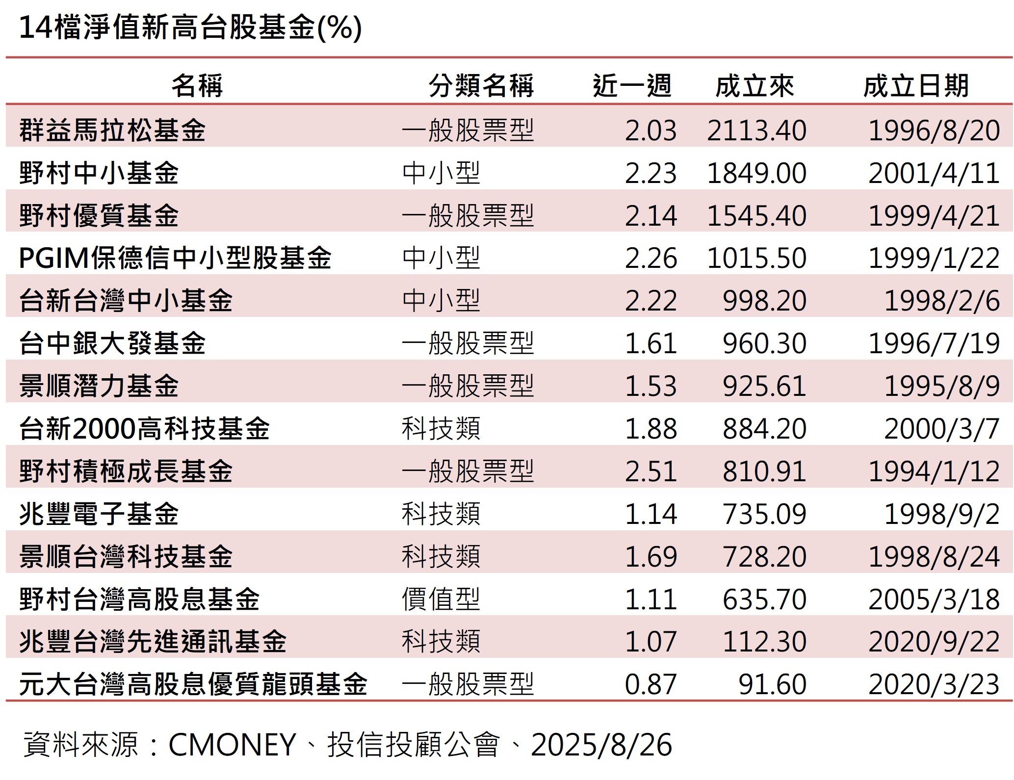 再看台股基金,截至7月底,整體規模首度突破6000億元大關。其中,有14檔淨值,近日領先大盤創下新高。