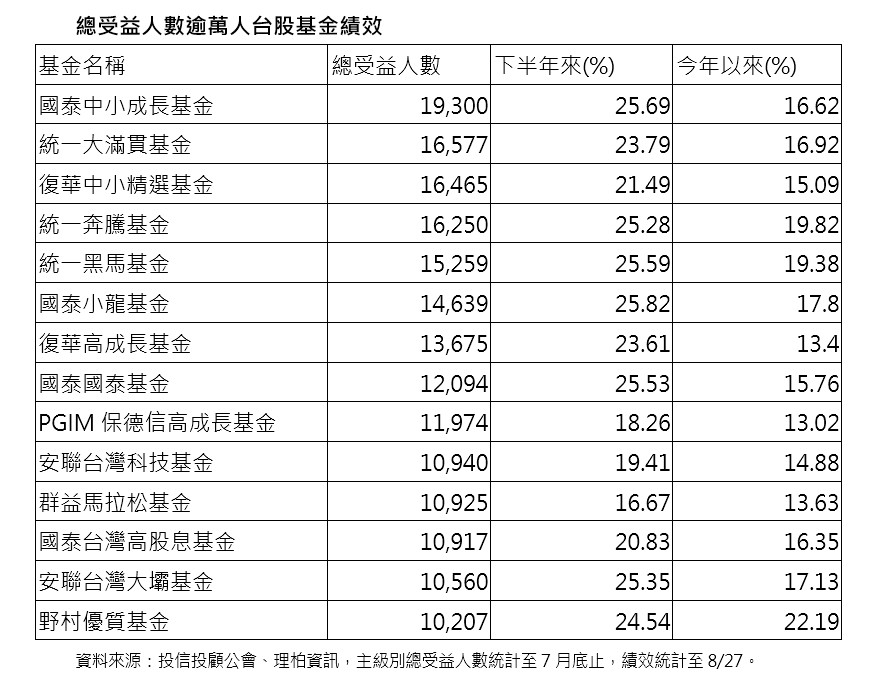若看受益人數逾萬人的人氣長青旗艦基金,共有14檔,其中,國泰4檔、統一3檔、復華、安聯各2檔,保德信、群益、野村各1檔,皆是各家招牌旗艦級基金,且成立時間大多都超過20年。且這14檔基金今年下半年及今年以來績效皆優於大盤,凸顯主動式操作在高檔震盪的行情中,有機會創造超額投資報酬。