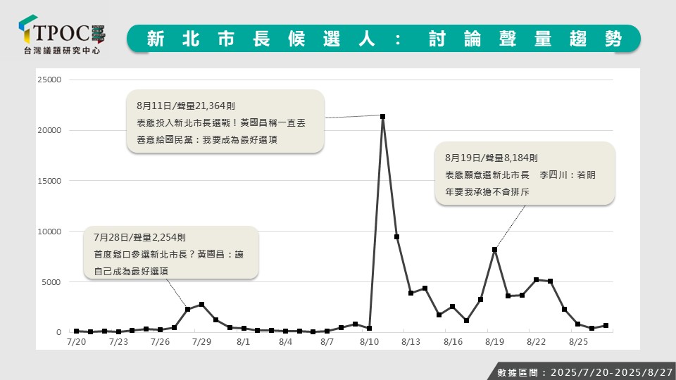 首先觀察近一個月網路對「新北市長候選人」的討論聲量變化。7月28日,黃國昌接受資深媒體人黃光芹專訪時,雖未正面宣布參選,但拋出「讓自己成為最好選項」的說法,當日聲量即升至2,254則。直到8月11日,黃國昌正式宣佈投入2026新北市長選舉,並向國民黨喊話「不排斥共推最強候選人」,相關消息瞬間引爆網路關注,單日聲量衝高至21,364則,也帶動後續整體討論熱度明顯抬升,自8月10日至8月25日期間,平均每日聲量維持在4,500則左右。接著在8月19日,一份新北市長民調公佈後,台北市副市長李四川也鬆口表示「若明年要我承擔,不會排斥」,再度掀起輿論熱議,當日聲量達8,184則。