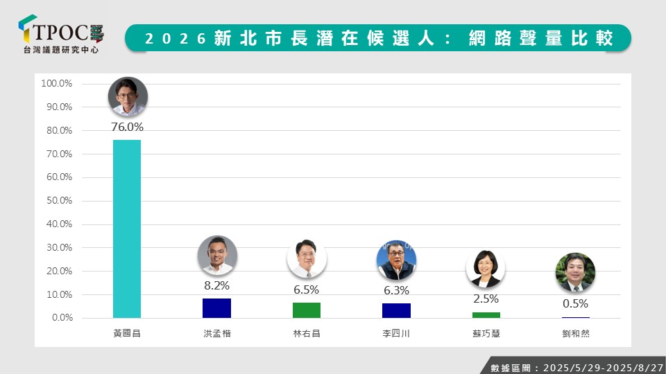 觀察六位潛在候選人近一季(5月29日至8月27日)的網路聲量變化,民眾黨主席黃國昌以超過200萬則的討論聲量遙遙領先,聲量佔比高達76%,與其他潛在人選形成懸殊差距。他的高聲量來源遍及多項重大政治議題,包括大罷免、核三公投以及「腳尾飯」風波,幾乎各大政治事件都可見其身影,黃國昌一人累積的聲量,已超過其餘五位候選人聲量總和。
