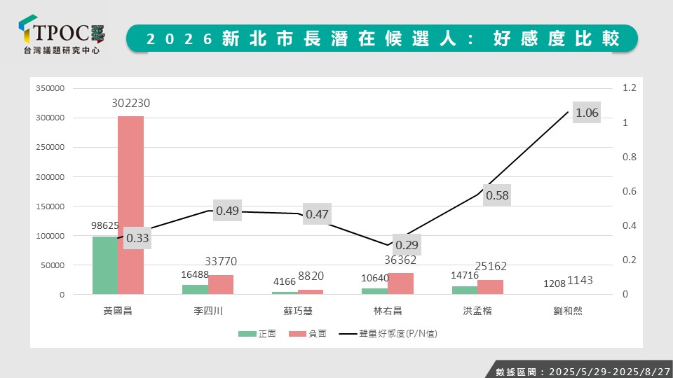 在國民黨候選人中,現任新北市副市長劉和然的好感度最高(1.06),但由於沒有什麼討論聲量,影響力非常有限。有網友直言「其實副市長很認真,但民調就是起不來。」李四川(0.49)與洪孟楷(0.58)同樣面臨「負評多於正評」的挑戰,雖然有媒體點名李四川為「新北市藍營候選人贏面最大」,仍不少年輕網友稱「沒聽過這號人物」,加上北市引進中國製機器狗巡邏引發資安爭議,也讓他一度捲入負面聲浪。至於洪孟楷,目前尚未明確表態參選,僅強調會支持同陣營最具民意的候選人。