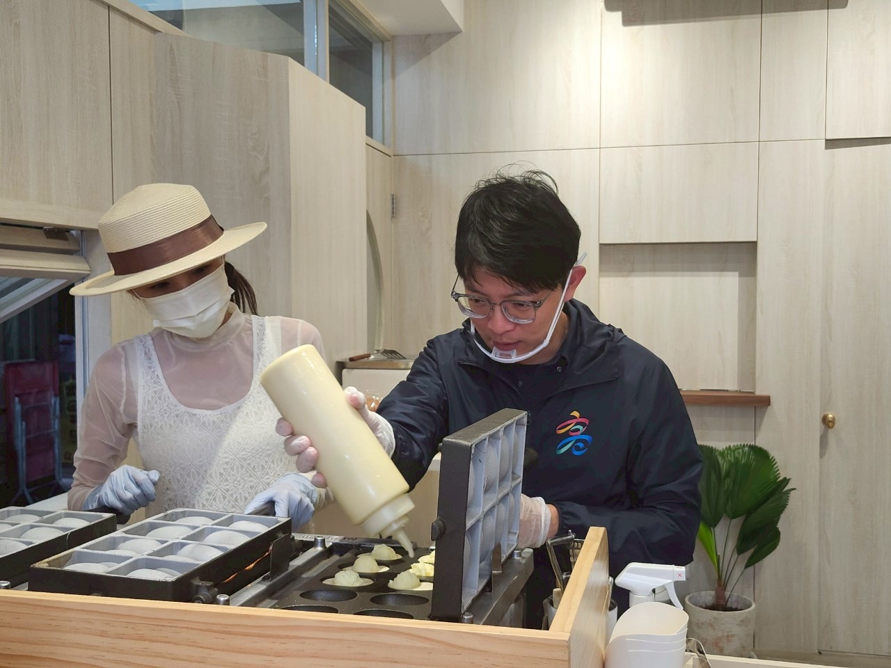 ↑圖說:林楷軒(右)在「Her呷雞蛋糕」負責人柯至柔(左)的指導下,親自體驗雞蛋糕製作。(圖片來源:高雄市青年局提供)
