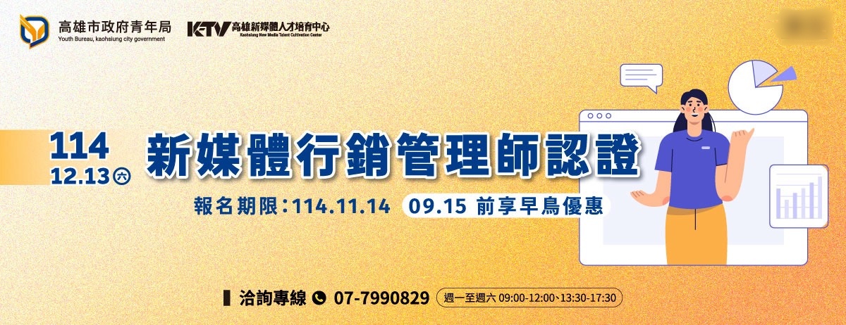 ↑圖說:高市青年局「K-TV新媒體人才培育中心」開辦「新媒體行銷管理師」證照考試,報名日期自即日起至114年11月14日止,預計12月13日考試。(圖片來源:高雄市青年局提供)