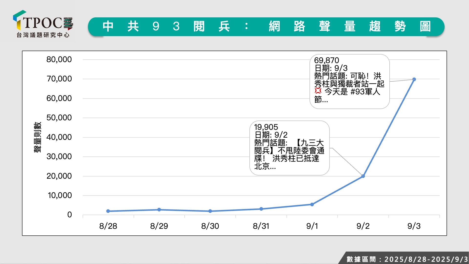 TPOC台灣議題研究中心透過QuickseeK快析輿情資料庫,蒐集近期的網路輿情聲量數據,分析網友們對於「93閱兵」的看法。數據分析結果顯示,在最近1周相關聲量逐漸增加,平均單日有近萬則討論度,但多數話題還是集中在9月2日、9月3日兩天發酵。第一個熱門話題出現在9月1日,熱門話題為媒體報導前總統馬英九及洪秀柱擬出席閱兵典禮,國民黨主席朱立倫回應兩岸訪問要守法,當天單日聲量超過5千多則;第二個熱門話題為9月2日當天,媒體報導洪秀柱已經抵達北京,即將參加閱兵典禮,單日刷破逾1.9萬則聲量;第三個熱門話題則是9月3日,洪秀柱出現在天安門城樓上,不少網友翻出2015年洪曾批評前主席連戰參加中共閱兵「未能考慮國人感受,傷害國人感情」的言論,引發熱烈討論,單日聲量超過6.9萬則。