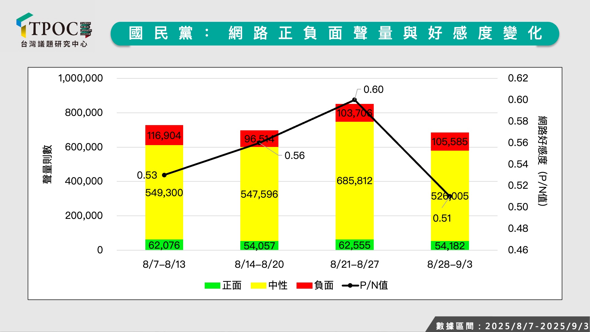 仔細觀察網路數據分析結果發現,在最近1個月以來,國民黨的網路好感度出現一個有趣的變化,前3周平均好感度維持在0.56左右變化不大,甚至可以達到0.6,但在最後一周好感度持續探底,平均只有0.51左右。有趣的是,身為前黨主席的洪秀柱赴中參加閱兵典禮,似乎並未成為主要負面聲浪來源,數據顯示,國民黨近一周主要負面聲量反而來自立法院內的攻防,如8月29日立法院協商追加預算案時,國民黨將文化部追加預算全部刪除,民進黨立院黨團幹事長吳思瑤被拍到「雙眼紅腫」,民進黨立委林宜瑾則批評是為大罷免「報復」,均吸引眾多網友留言、轉載討論。