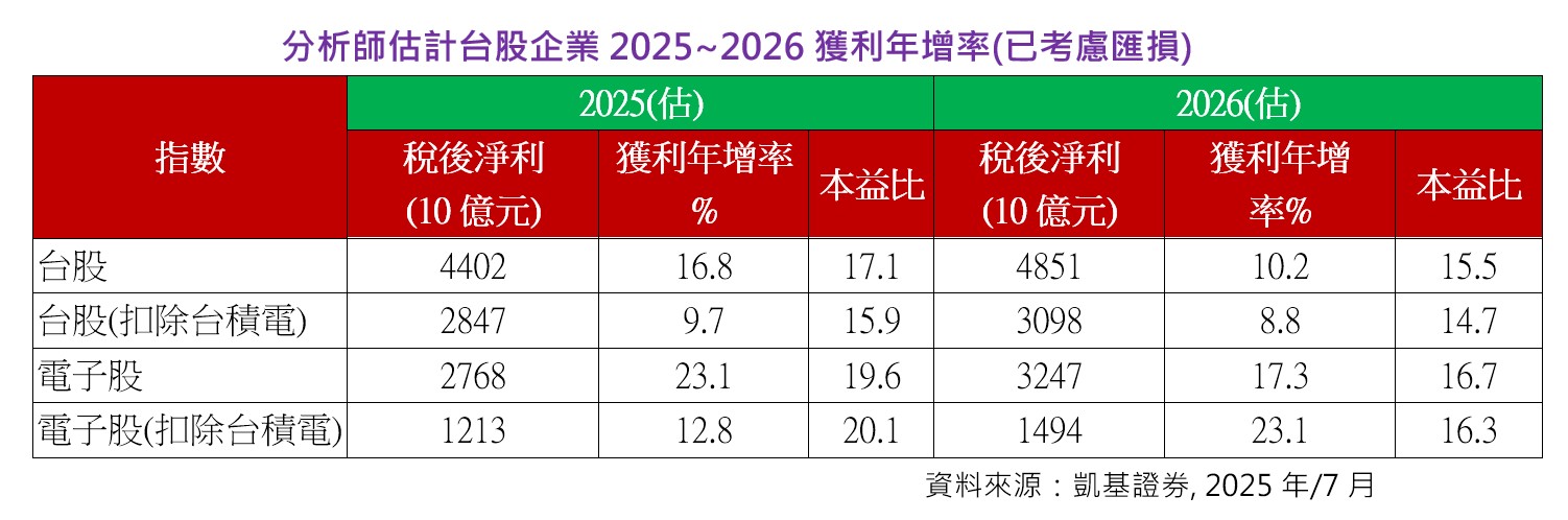 台新投信指出,市場對關稅議題反映也逐步淡化,加上市場普遍預期Fed可望於9月降息,持續激勵台股人氣。展望後市,受惠AI產業成長趨勢明確,分析師估計,即使考慮匯損,2025年台股企業獲利年增率仍有逾16%的高水準,並估計2026年獲利年增率亦有二位數的水準,台股後市仍有高點可期,短線若急跌可分批布局,建議優先布局台灣優息AI ETF,可同時兼顧資本利得成長契機及配息現金流。