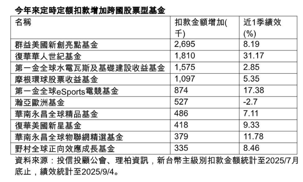 投資人不但熱衷台股,也將目光投向國外市場,據統計,跨國投資股票型基金中,以美股、趨勢產業主題最受小額投資人受青睞,歐洲及防禦性公用事業主題也異軍突起,今年來定時定額扣款金額逆勢成長,表現相對亮眼。