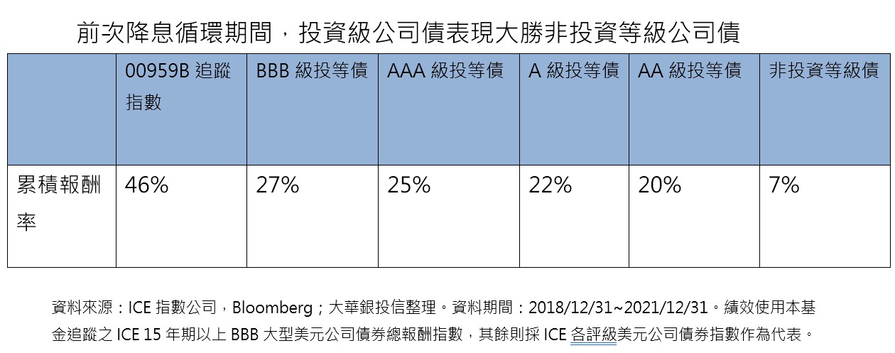 根據ICE指數公司、彭博數據統計,前次降息循環期間(2018年底至2021年末),投資人若在降息前6個月進場投資,並持有至降息結束,投資等級債累積報酬率皆在20%以上,BBB級投資等級債報酬表現達到27%,績效都大幅勝過非投資等級債。