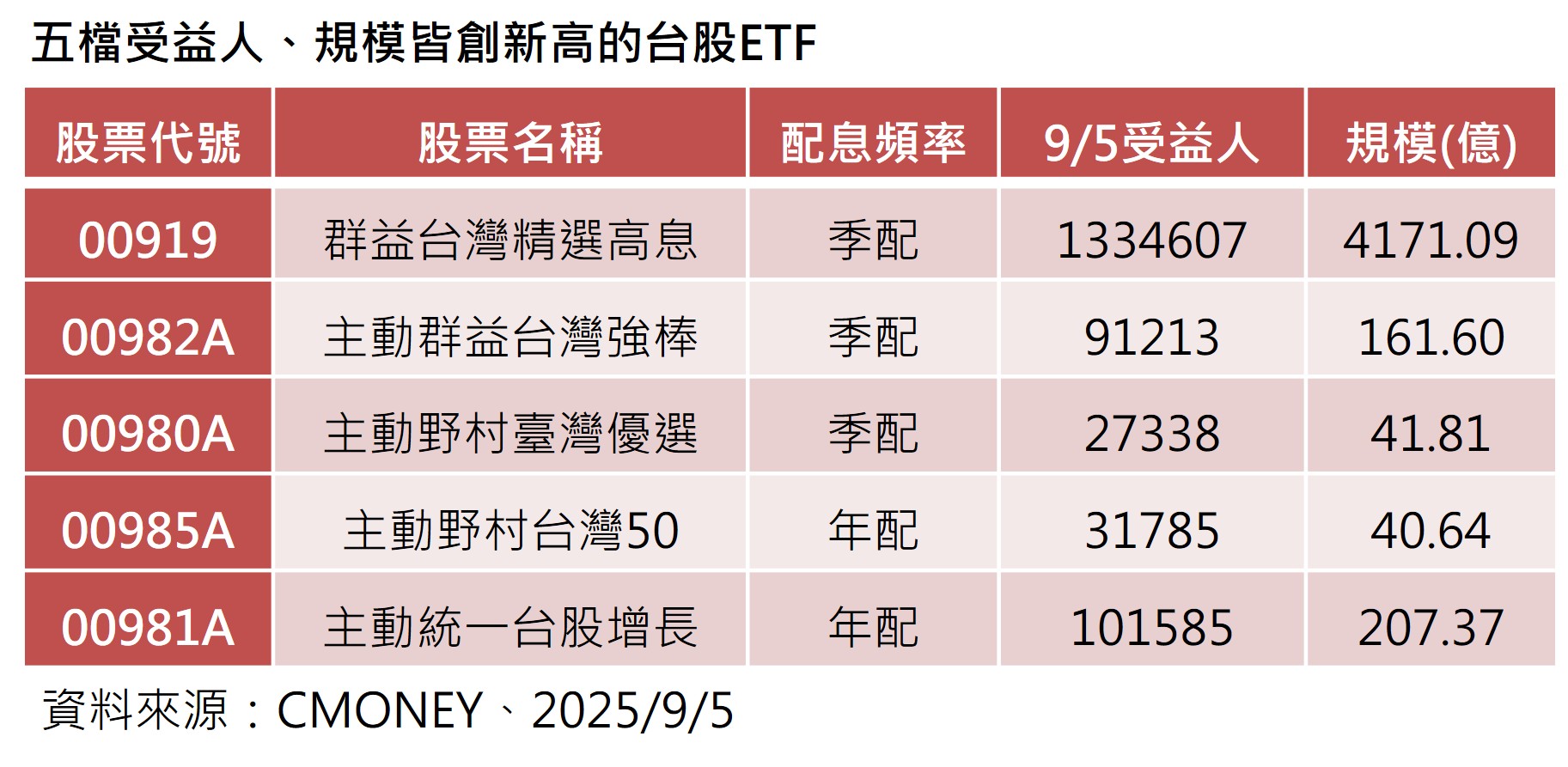 台股投資熱潮連帶讓台股ETF表現強強滾,主被動台股ETF已有5檔規模與受益人同創新高,其中,僅1檔台灣精選高息(00919)是被動式台股ETF,其他包括主動群益台灣強棒(00982A)在內4檔都是主動式台股ETF。