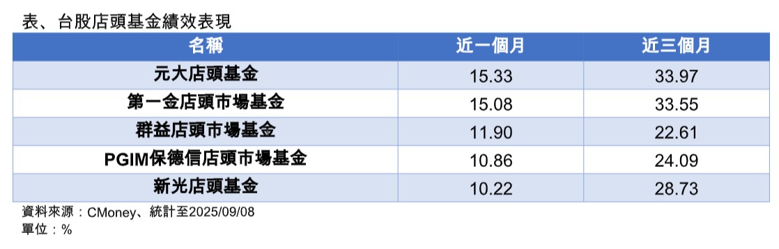 台股強勢演出,台股上櫃股票型基金近月績效表現也有好表現,截至昨天為止,元大店頭基金、第一金店頭市場基金,均上漲逾15%,居於領先;群益店頭市場基金、PGIM保德信店頭市場基金、新光店頭基金緊隨在後,上漲逾10%,整體表現優異。