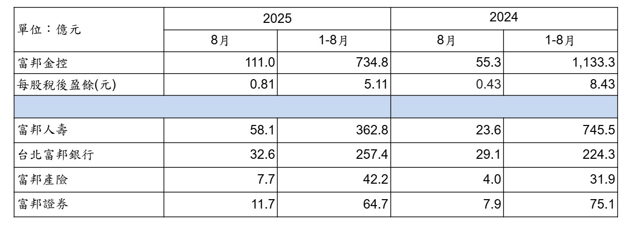 子公司台北富邦銀行8月及累計前8月獲利均創下歷年同期新高;富邦產險與富邦證券8月獲利皆創下歷史新高、累計前8月獲利亦皆為歷年同期次高。