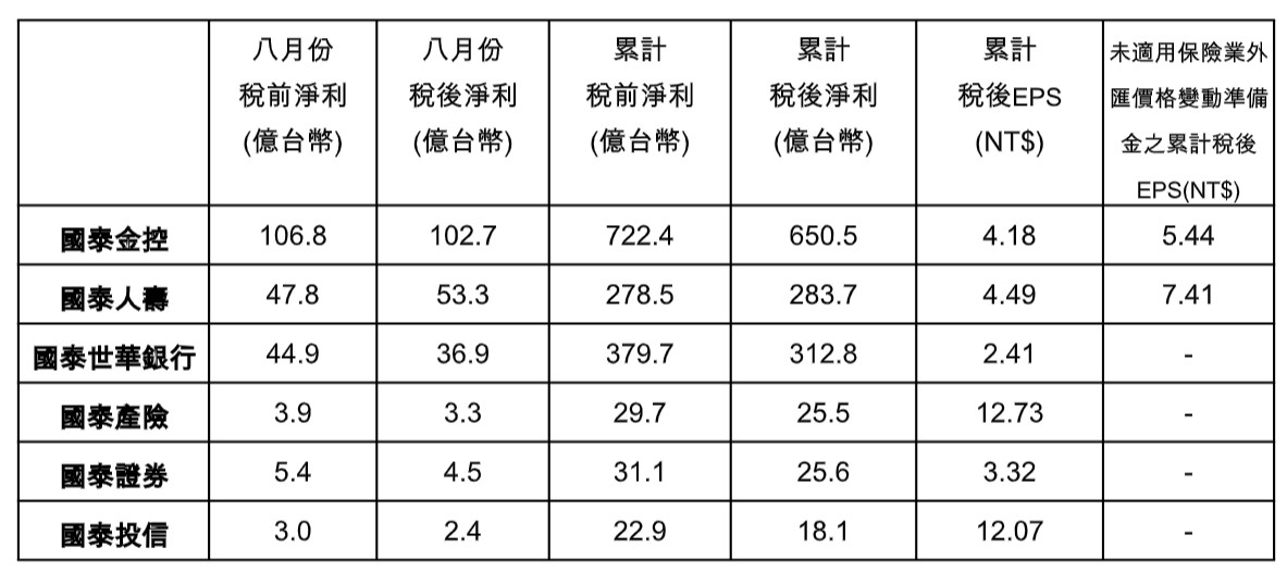 國泰金自結8月稅後淨利102.7億元,累計前8月稅後淨利650.5億元,EPS自結4.18元,蟬聯金控獲利亞軍。