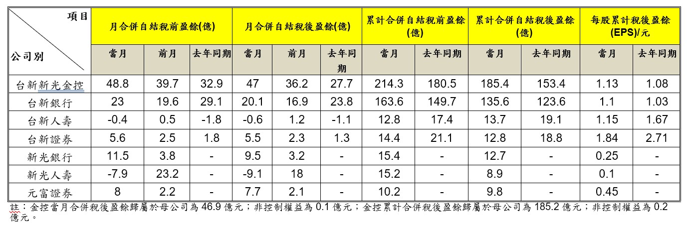 最後壓軸公布獲利的是台新新光金控,8月自結稅後淨利47億元,累計每股稅後淨利(EPS)1.13元。