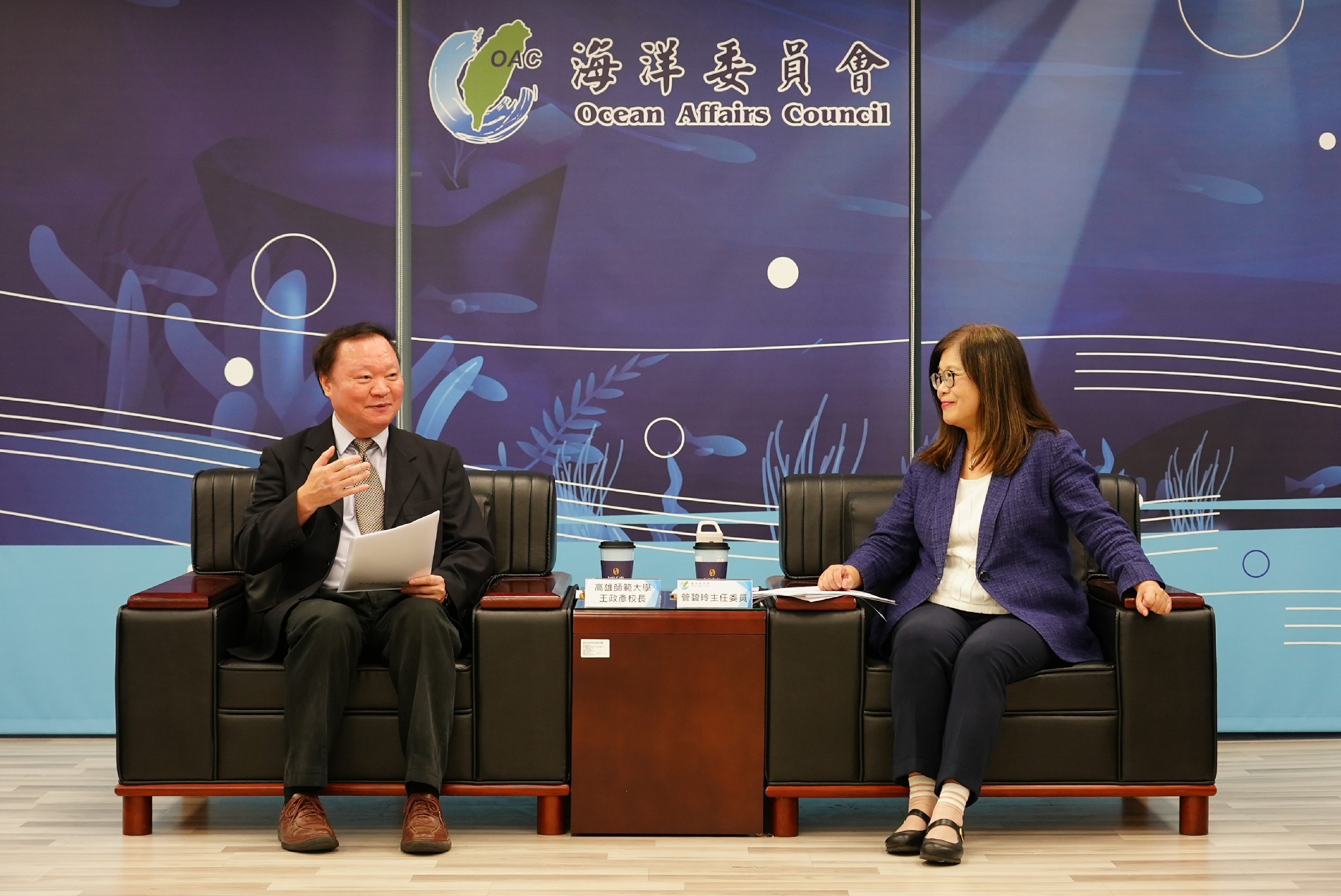 ↑圖說:海洋委員會主委管碧玲(右)與國立高雄師範大學校長王政彥(左)進行深度討論與交流(圖片來源:海洋委員會提供)