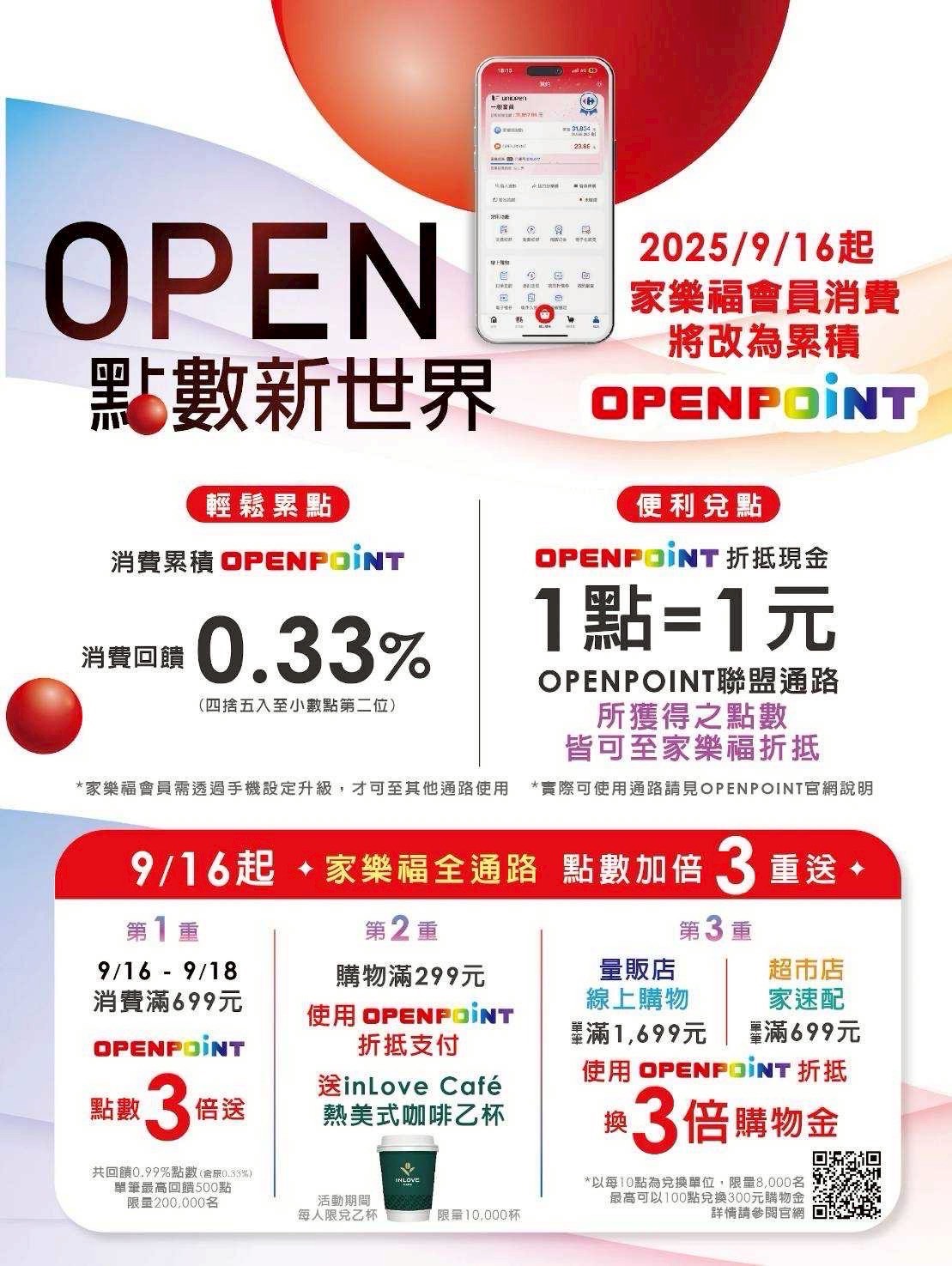 為慶祝加入uniopen,家樂福同步推出「點數3重送」活動:9月16日至18日全通路消費滿699元享3倍點數回饋;期間單筆消費滿299元並使用OPENPOINT折抵,還可兌換INLOVE CAFE美式咖啡;單筆滿額更能用點數兌換3倍購物金,限量回饋吸引力十足。