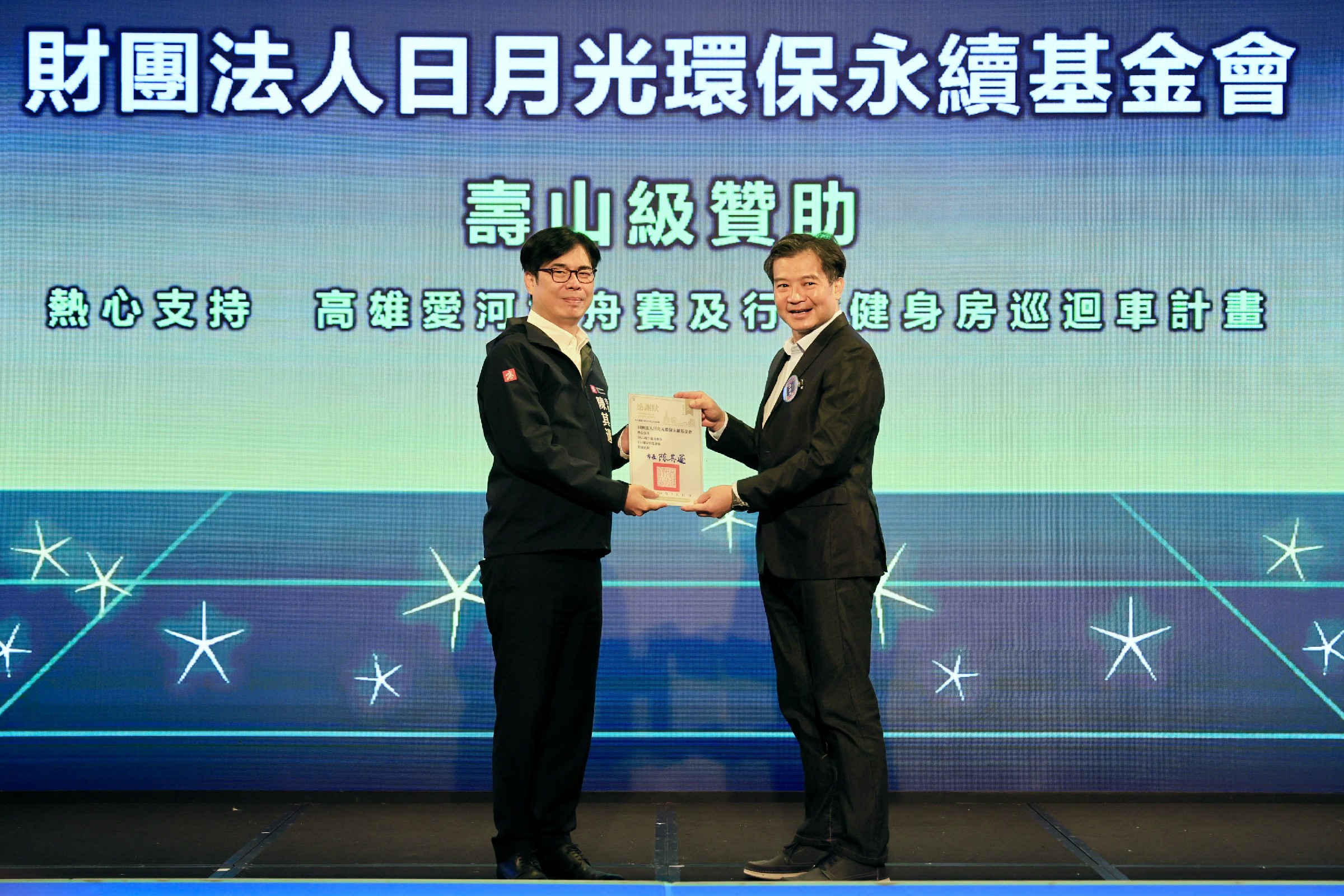 ↑圖說:陳其邁頒獎給壽山級贊助企業—財團法人日月光環保永續基金會。(圖片來源:高雄市運發局提供)